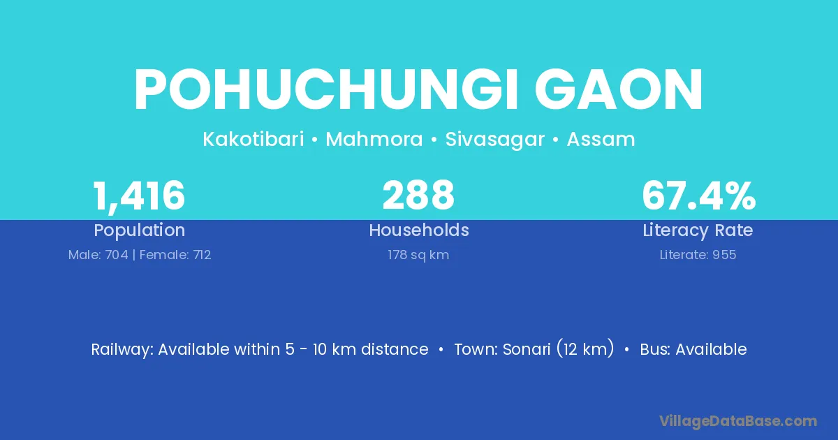 Pohuchungi Gaon village has a total population of 1,416 people, of which 704 are males and 712 are females.