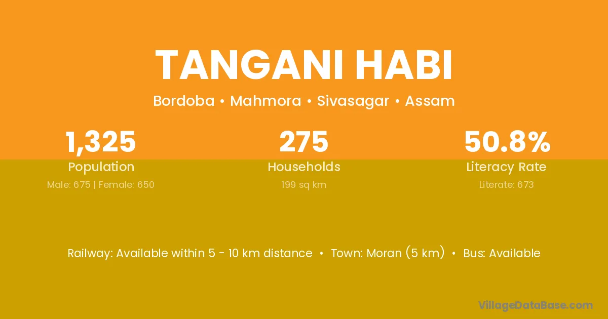 Moran (5 km) is the nearest town to Tangani Habi village for major economic activities and is located approximately 5 km away.
