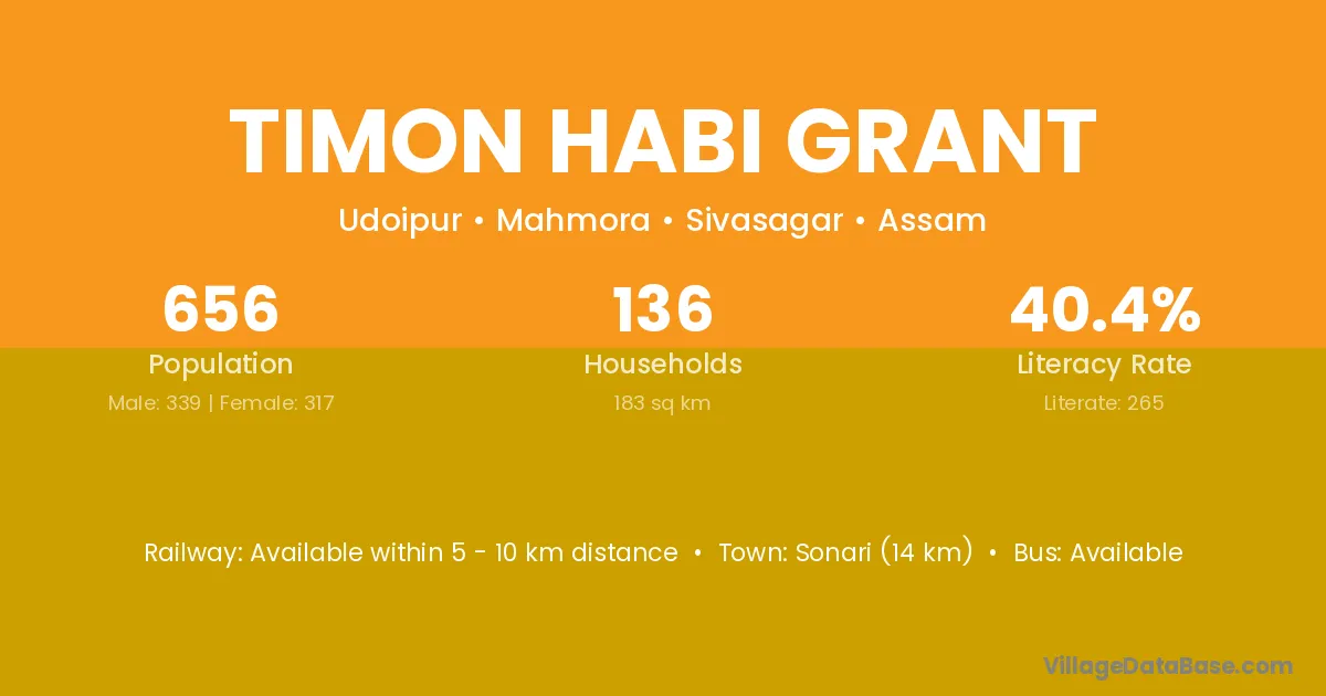 Sonari (14 km) is the nearest town to Timon Habi Grant village for major economic activities and is located approximately 14 km away.