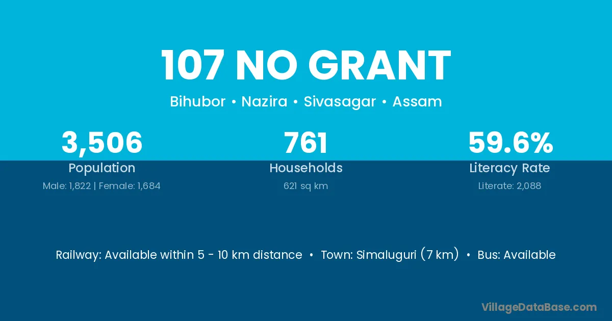 Simaluguri (7 km) is the nearest town to 107 No Grant village for major economic activities and is located approximately 7 km away.