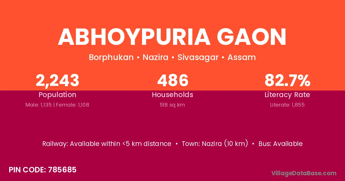 Nazira (10 km) is the nearest town to Abhoypuria Gaon village for major economic activities and is located approximately 10 km away.