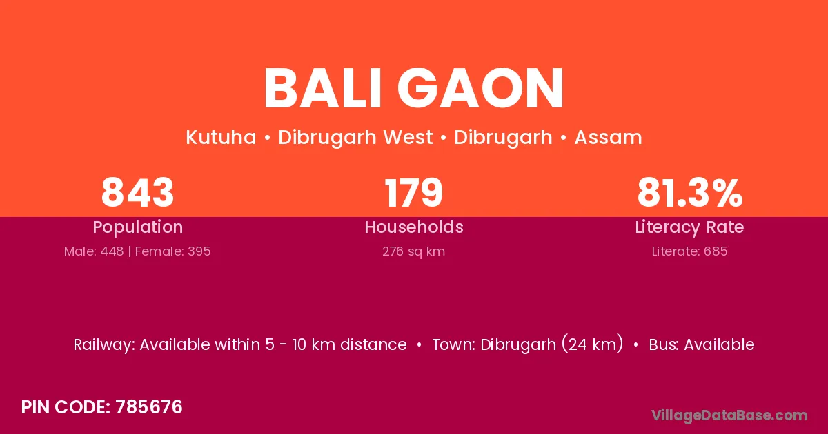 Simaluguri (7 km) is the nearest town to Bali Gaon village for major economic activities and is located approximately 7 km away.