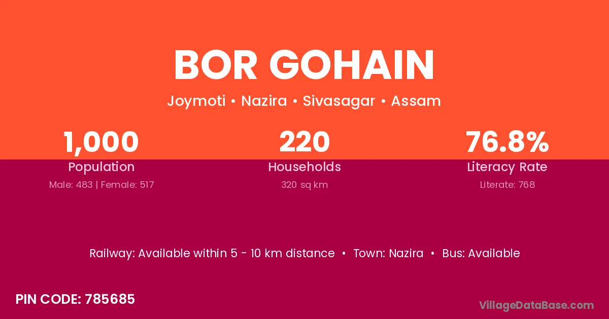 Bor Gohain village has a total population of 1,000 people, of which 483 are males and 517 are females.