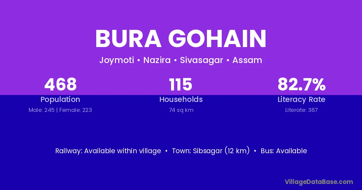 Bura Gohain village has a total population of 468 people, of which 245 are males and 223 are females.