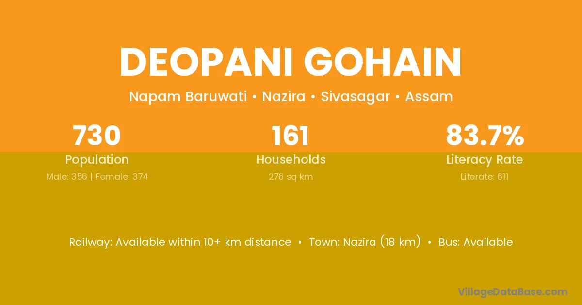 Nazira (18 km) is the nearest town to Deopani Gohain village for major economic activities and is located approximately 18 km away.