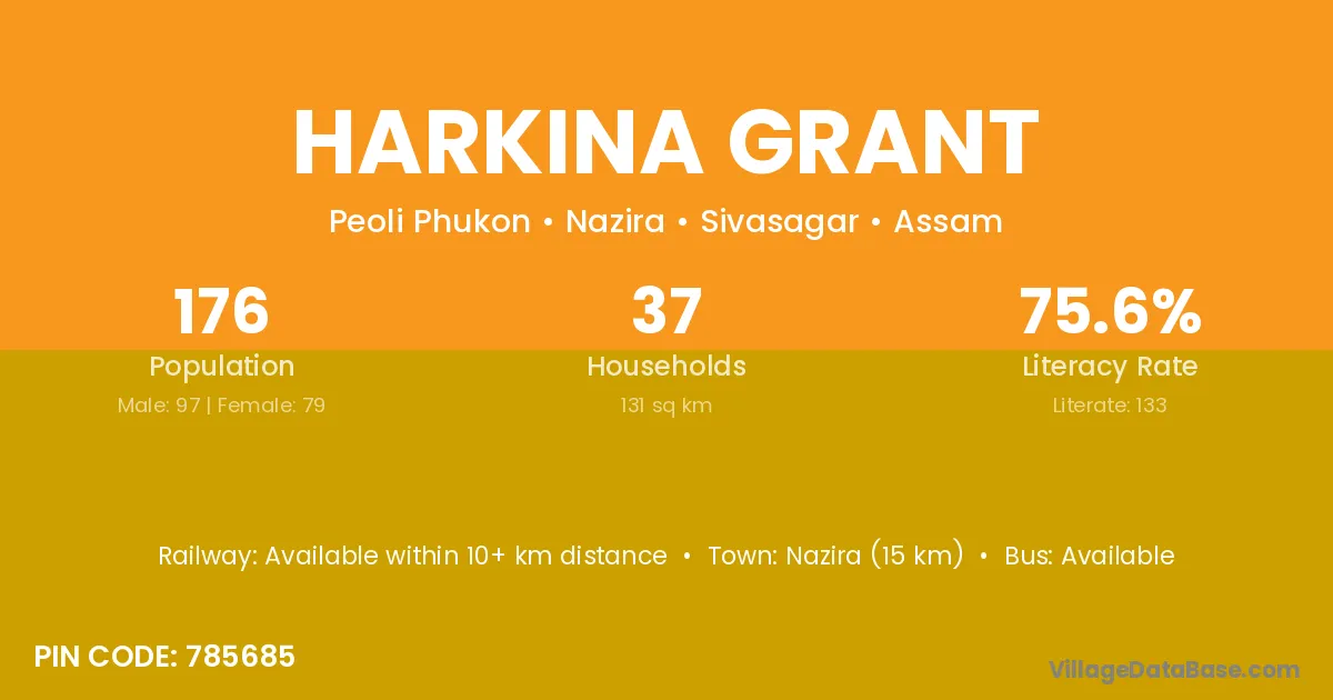 Nazira (15 km) is the nearest town to Harkina Grant village for major economic activities and is located approximately 15 km away.