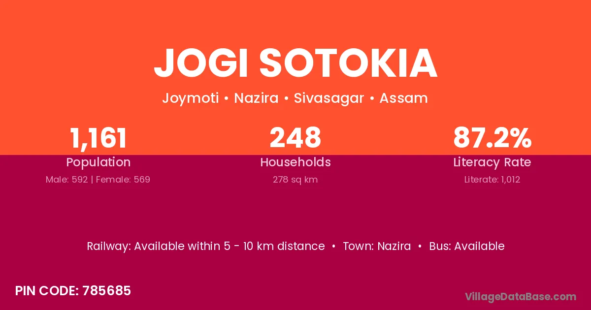 Jogi Sotokia village has a total population of 1,161 people, of which 592 are males and 569 are females.