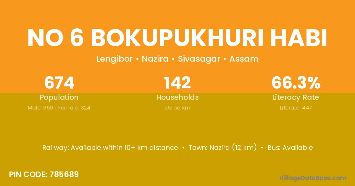 Nazira (12 km) is the nearest town to No 6 Bokupukhuri Habi village for major economic activities and is located approximately 12 km away.