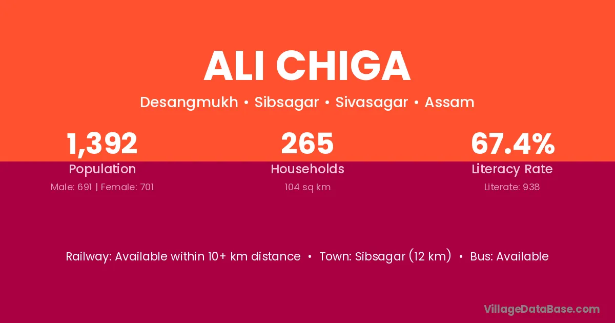 Sibsagar (12 km) is the nearest town to Ali Chiga village for major economic activities and is located approximately 12 km away.