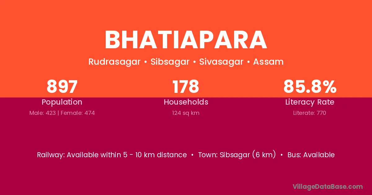 Sibsagar (6 km) is the nearest town to Bhatiapara village for major economic activities and is located approximately 6 km away.