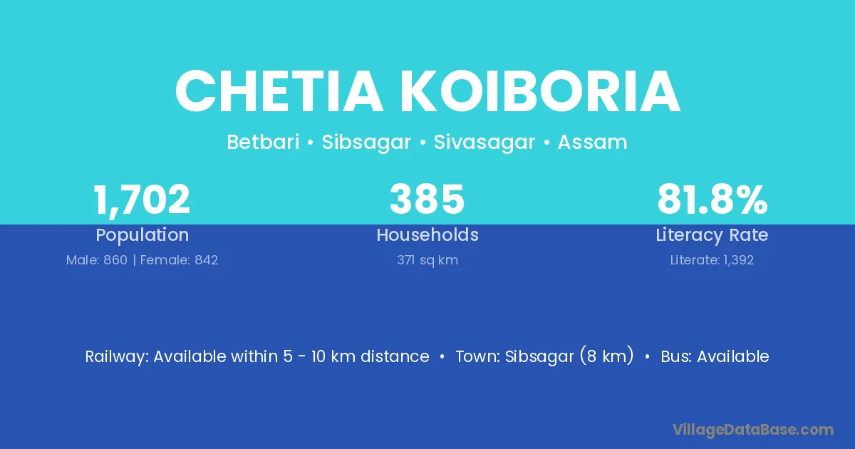 Sibsagar (8 km) is the nearest town to Chetia Koiboria village for major economic activities and is located approximately 8 km away.