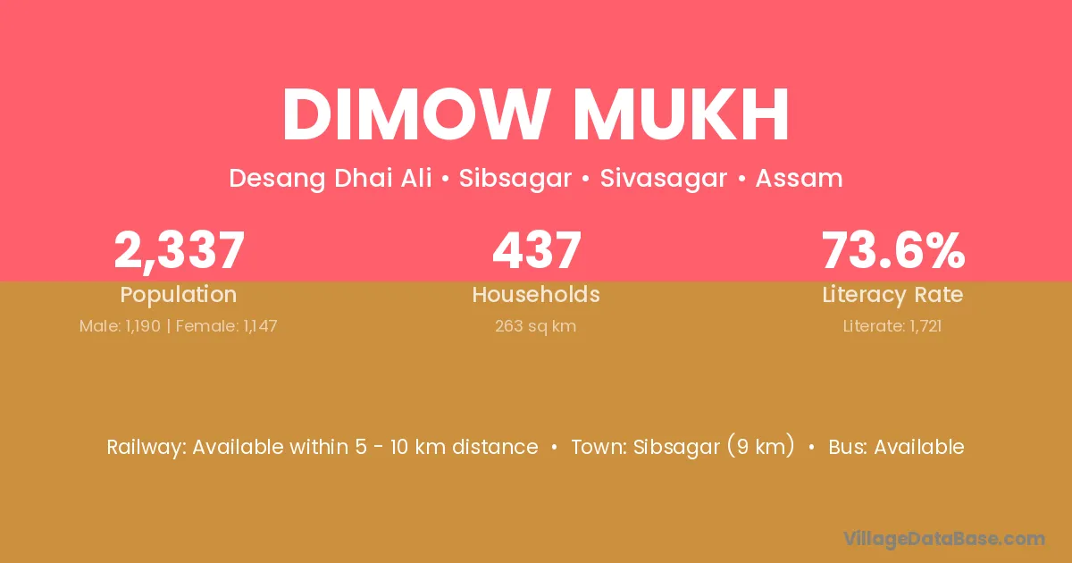 Sibsagar (9 km) is the nearest town to Dimow Mukh village for major economic activities and is located approximately 9 km away.