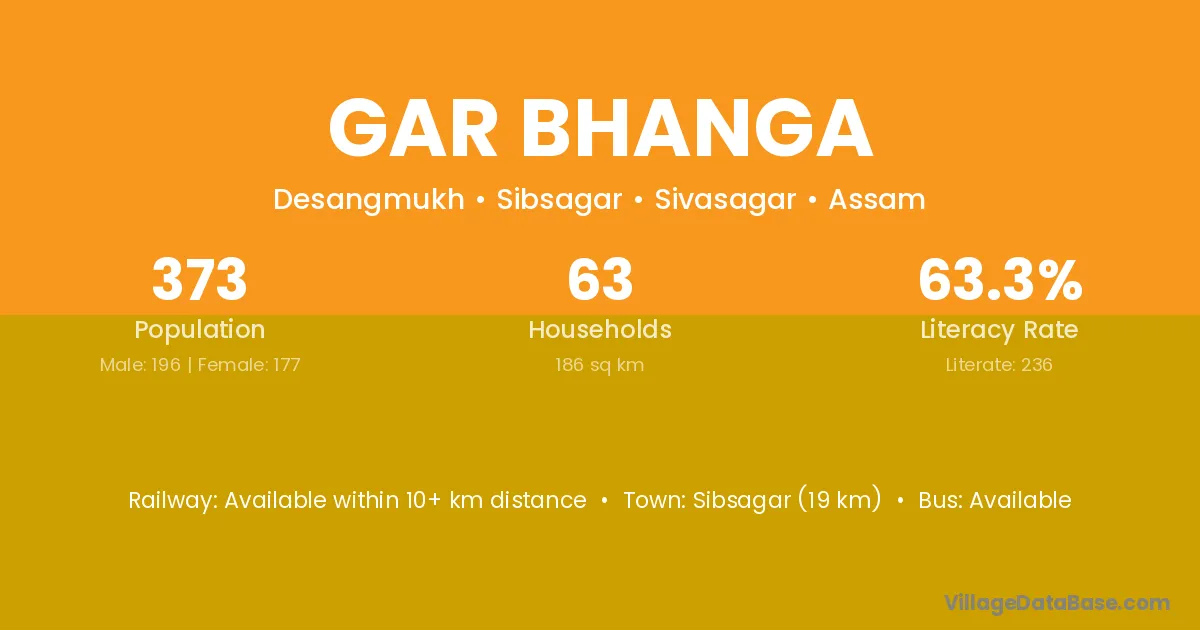 Sibsagar (19 km) is the nearest town to Gar Bhanga village for major economic activities and is located approximately 19 km away.