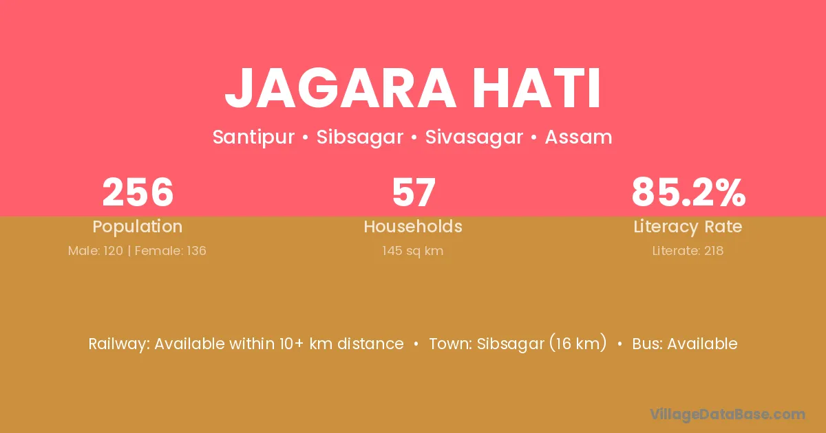 Sibsagar (16 km) is the nearest town to Jagara Hati village for major economic activities and is located approximately 16 km away.