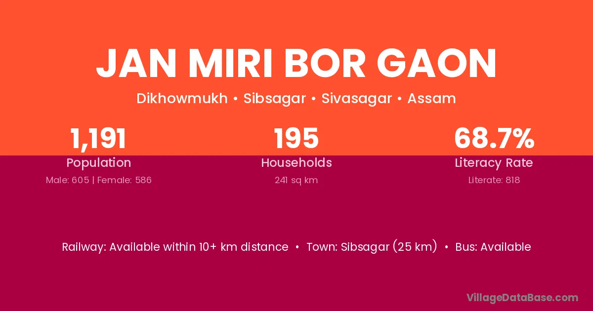 Jan Miri Bor Gaon village has a total population of 1,191 people, of which 605 are males and 586 are females.
