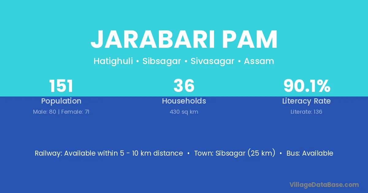 Sibsagar (25 km) is the nearest town to Jarabari Pam village for major economic activities and is located approximately 25 km away.