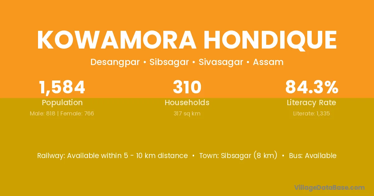 Sibsagar (8 km) is the nearest town to Kowamora Hondique village for major economic activities and is located approximately 8 km away.