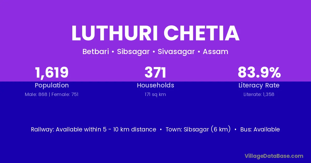 Luthuri Chetia village has a total population of 1,619 people, of which 868 are males and 751 are females.