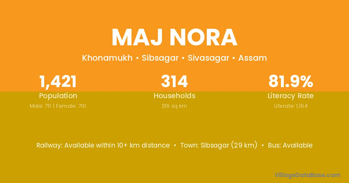 Sibsagar (29 km) is the nearest town to Maj Nora village for major economic activities and is located approximately 29 km away.