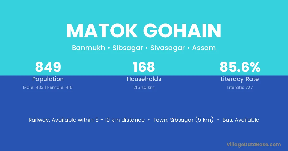 Sibsagar (5 km) is the nearest town to Matok Gohain village for major economic activities and is located approximately 5 km away.
