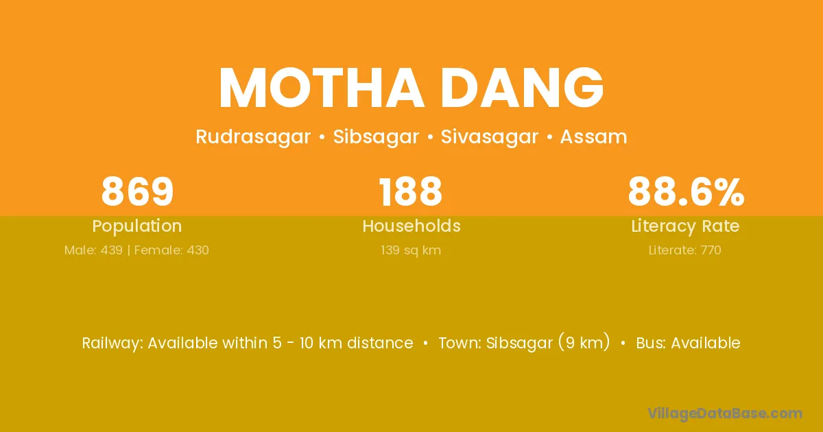 Sibsagar (9 km) is the nearest town to Motha Dang village for major economic activities and is located approximately 9 km away.