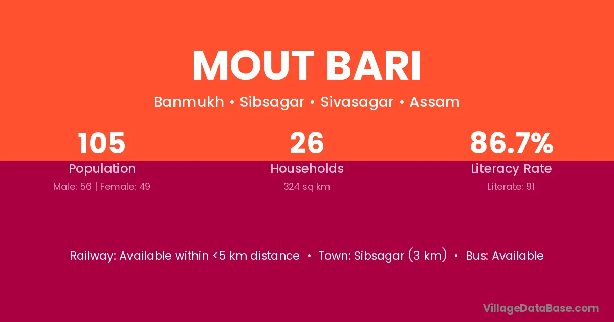 Sibsagar (3 km) is the nearest town to Mout Bari village for major economic activities and is located approximately 3 km away.