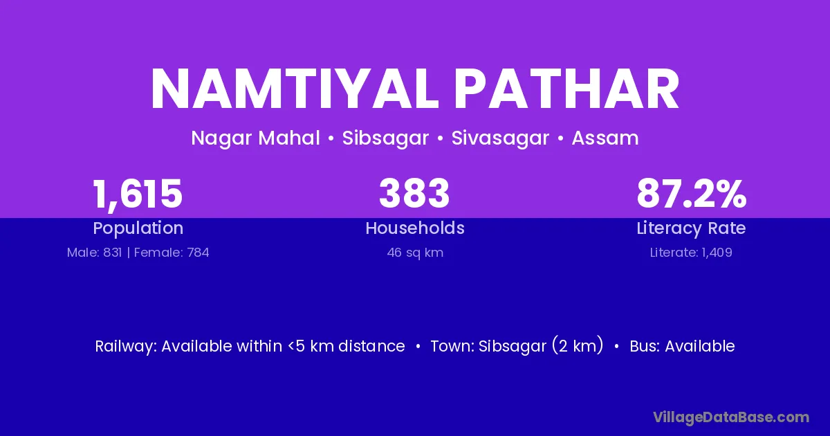Sibsagar (2 km) is the nearest town to Namtiyal Pathar village for major economic activities and is located approximately 2 km away.