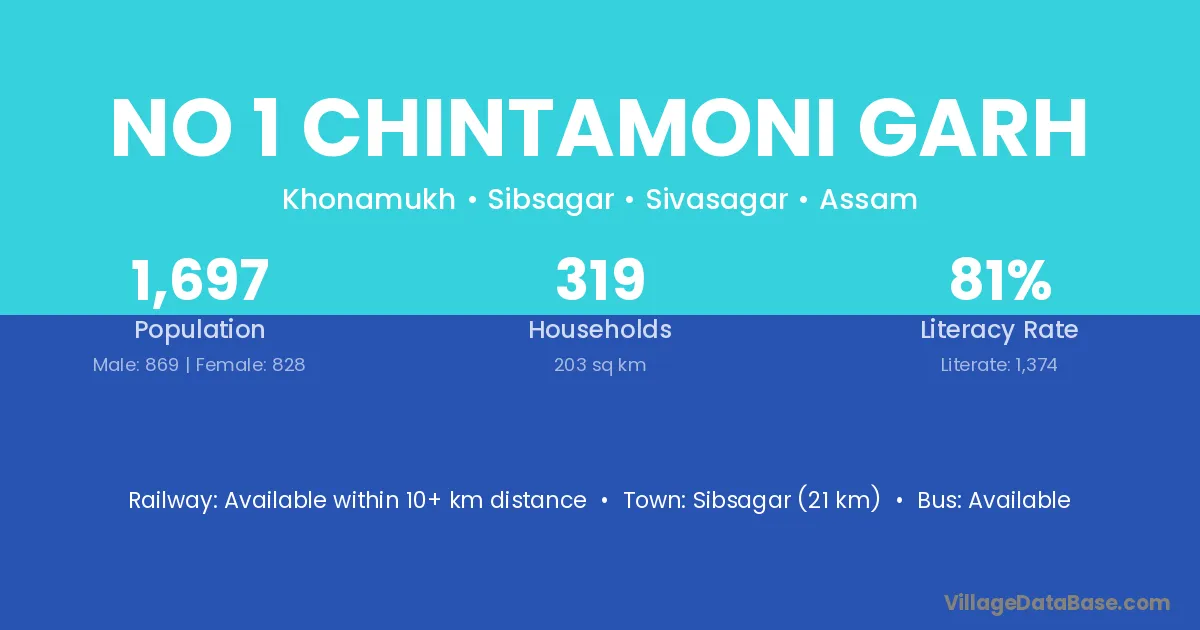 Sibsagar (21 km) is the nearest town to No 1 Chintamoni Garh village for major economic activities and is located approximately 21 km away.