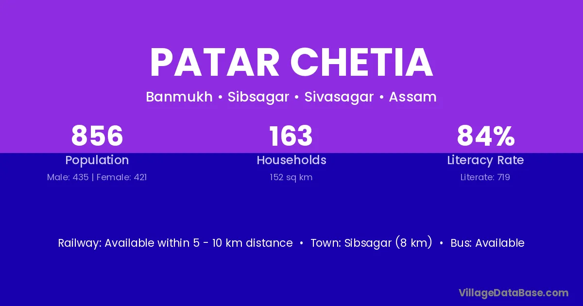 Sibsagar (8 km) is the nearest town to Patar Chetia village for major economic activities and is located approximately 8 km away.