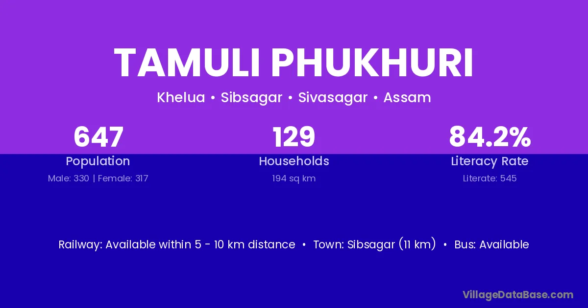 Tamuli Phukhuri village has a total population of 647 people, of which 330 are males and 317 are females.
