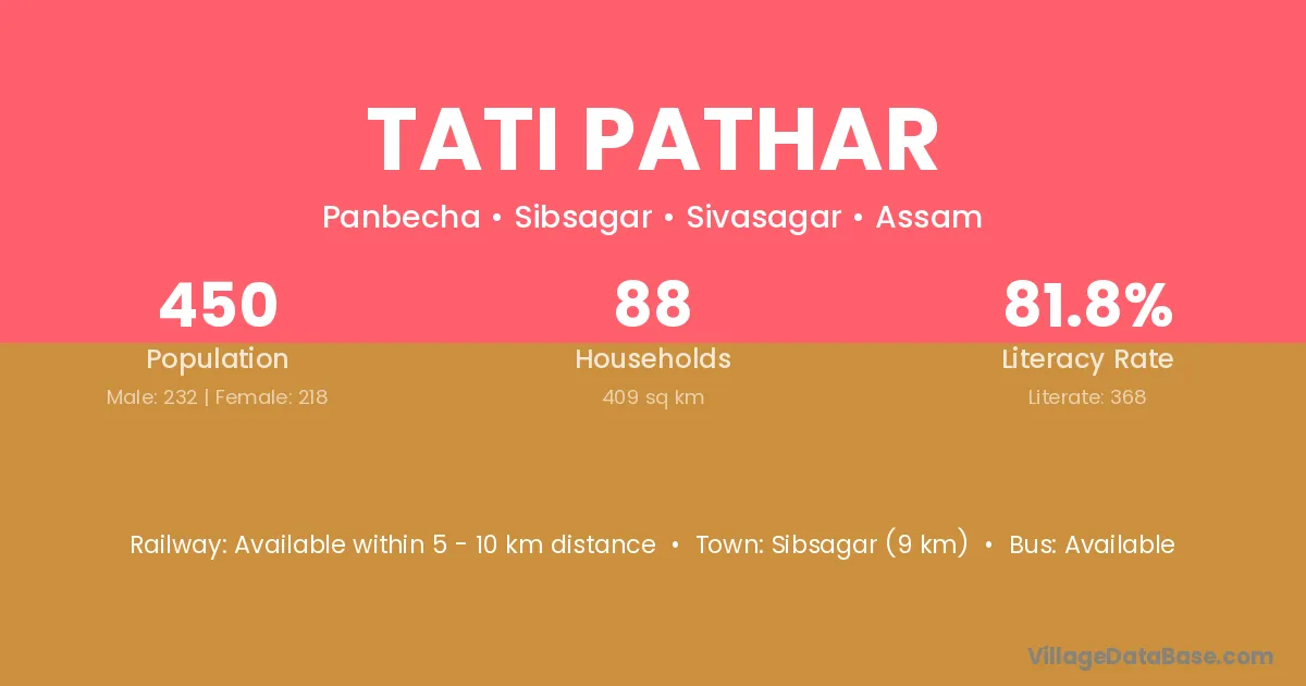 Sibsagar (9 km) is the nearest town to Tati Pathar village for major economic activities and is located approximately 9 km away.