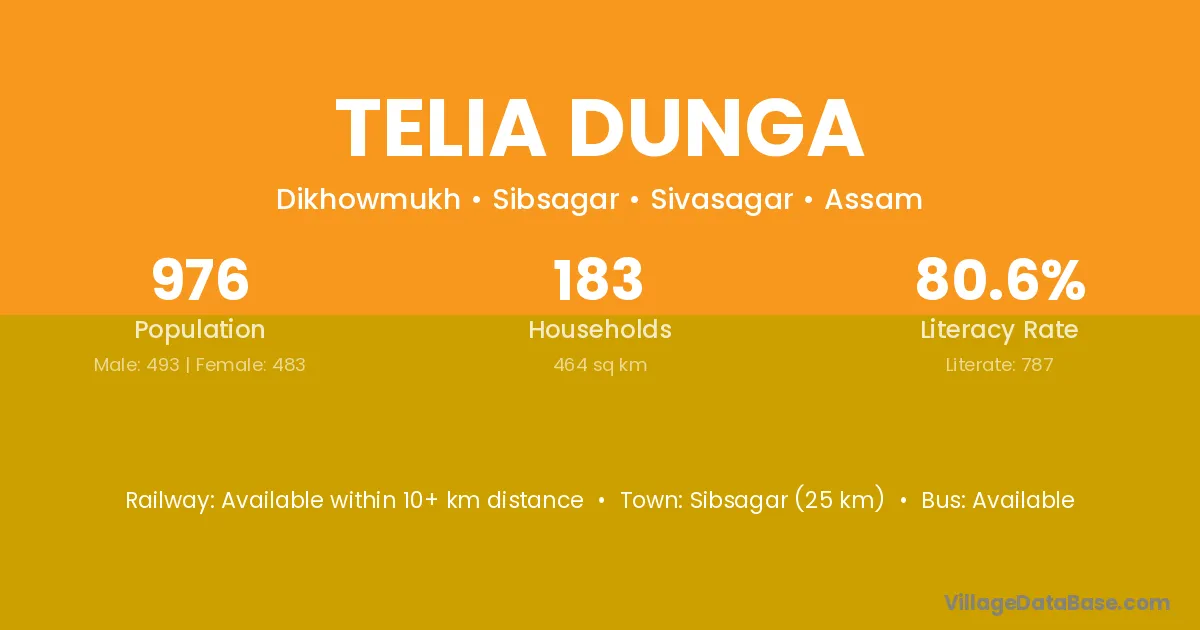 Sibsagar (25 km) is the nearest town to Telia Dunga village for major economic activities and is located approximately 25 km away.