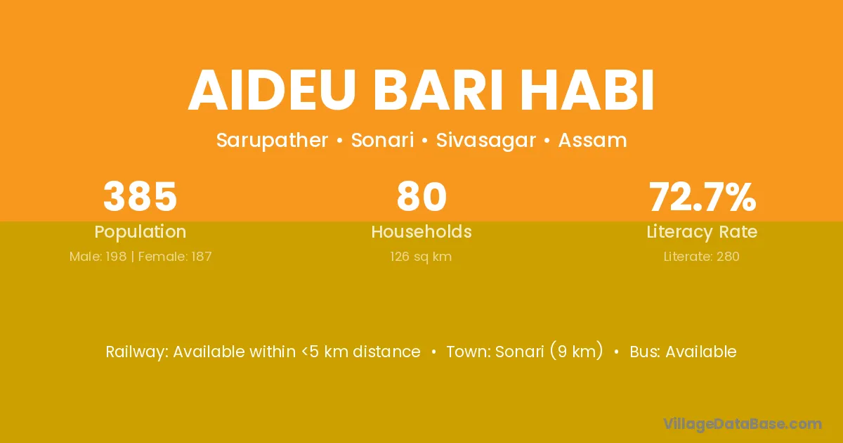 Sonari (9 km) is the nearest town to Aideu Bari Habi village for major economic activities and is located approximately 9 km away.