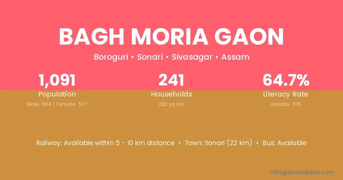 Sonari (22 km) is the nearest town to Bagh Moria Gaon village for major economic activities and is located approximately 22 km away.