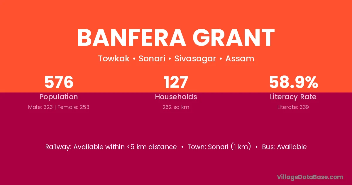 Sonari (1 km) is the nearest town to Banfera Grant village for major economic activities and is located approximately 1 km away.