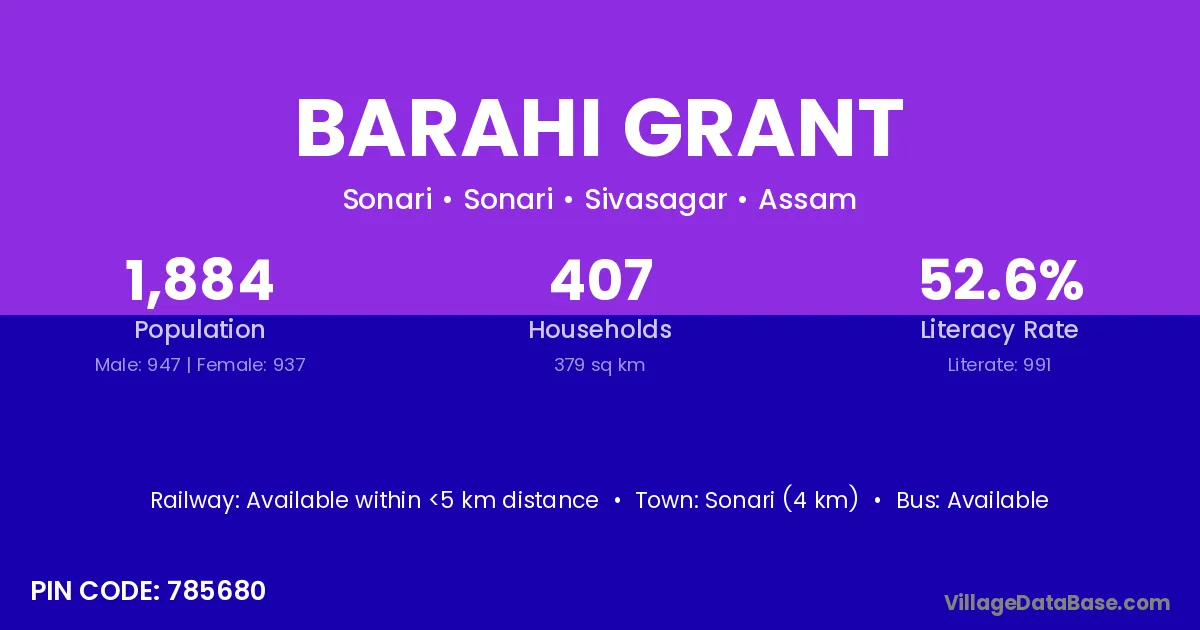 Sonari (4 km) is the nearest town to Barahi Grant village for major economic activities and is located approximately 4 km away.