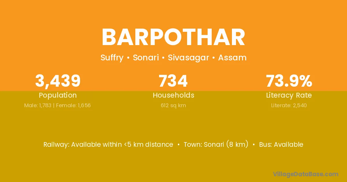 Sonari (8 km) is the nearest town to Barpothar village for major economic activities and is located approximately 8 km away.