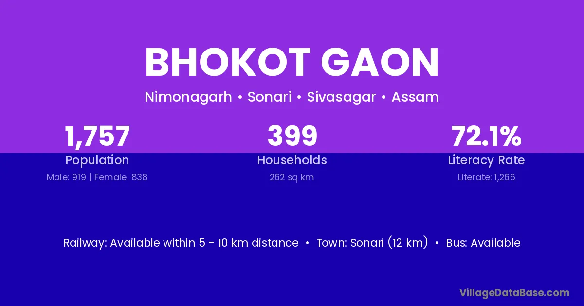 Sonari (12 km) is the nearest town to Bhokot Gaon village for major economic activities and is located approximately 12 km away.