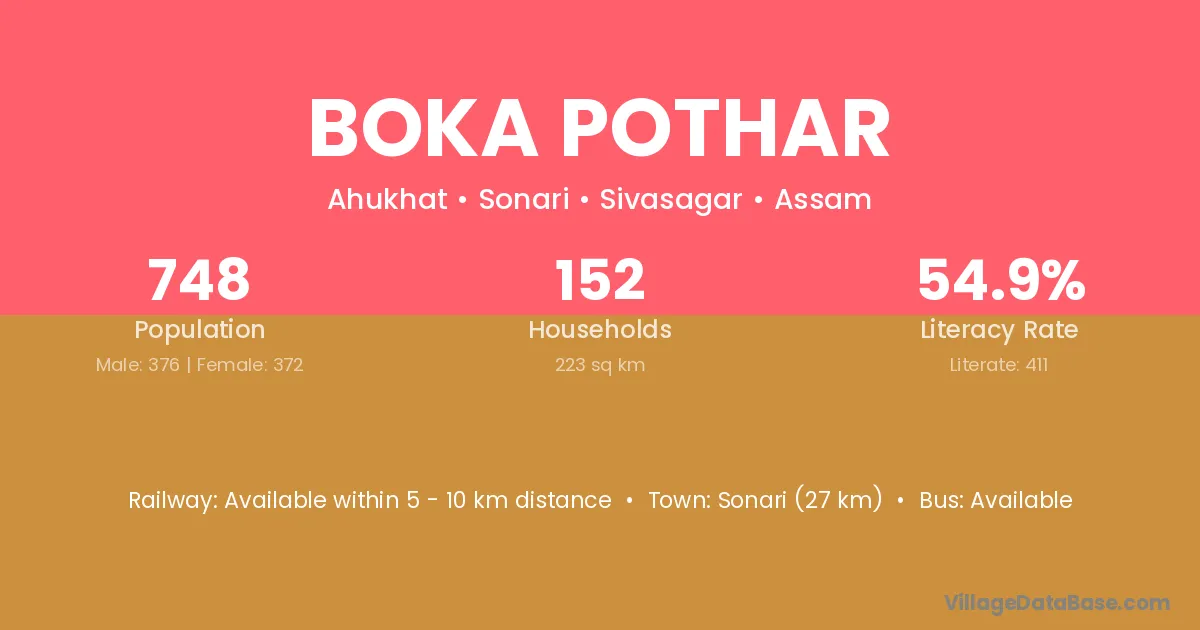 Sonari (27 km) is the nearest town to Boka Pothar village for major economic activities and is located approximately 27 km away.