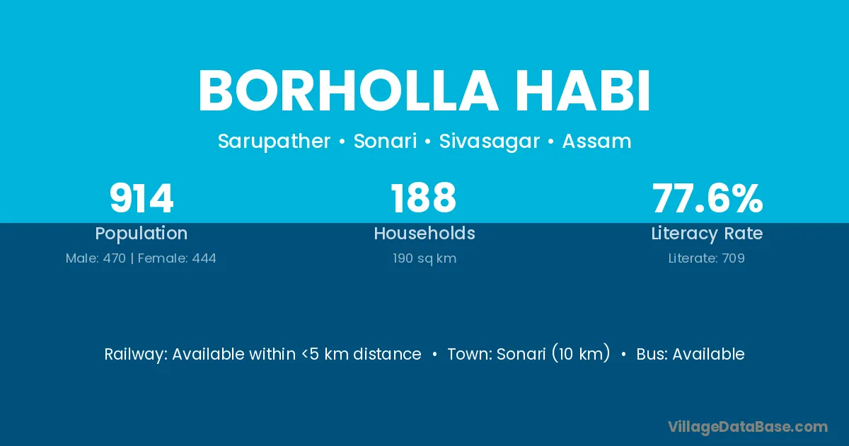 Sonari (10 km) is the nearest town to Borholla Habi village for major economic activities and is located approximately 10 km away.