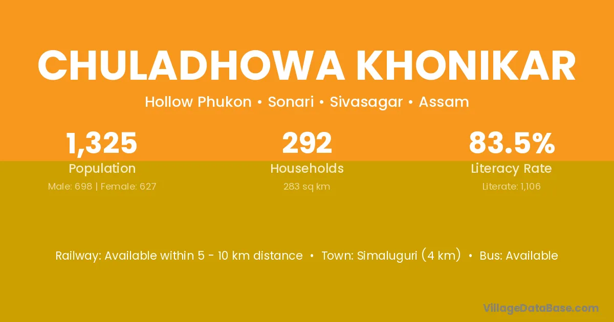 Chuladhowa Khonikar village has a total population of 1,325 people, of which 698 are males and 627 are females.