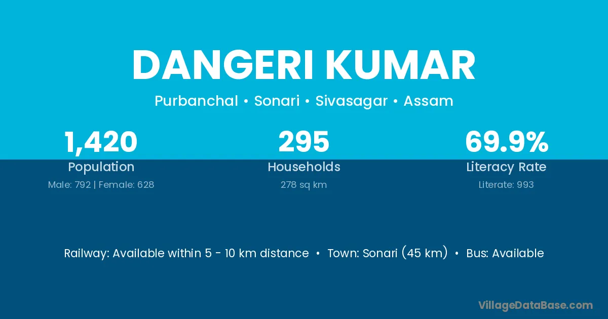 Sonari (45 km) is the nearest town to Dangeri Kumar village for major economic activities and is located approximately 45 km away.