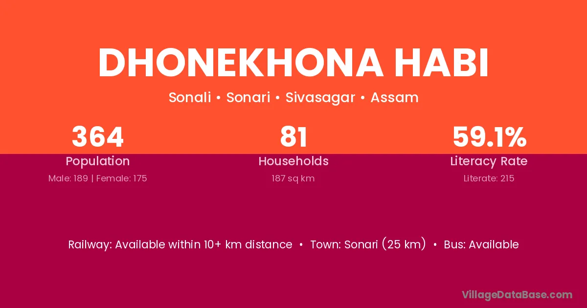 Sonari (25 km) is the nearest town to Dhonekhona Habi village for major economic activities and is located approximately 25 km away.