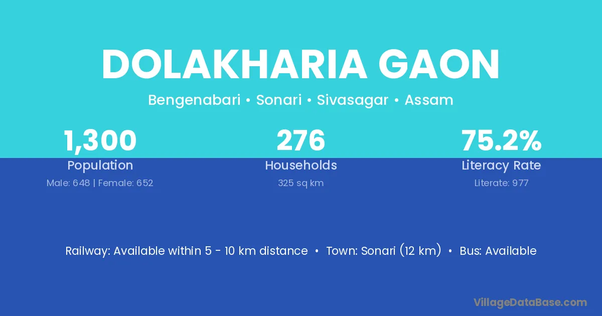 Dolakharia Gaon village has a total population of 1,300 people, of which 648 are males and 652 are females.