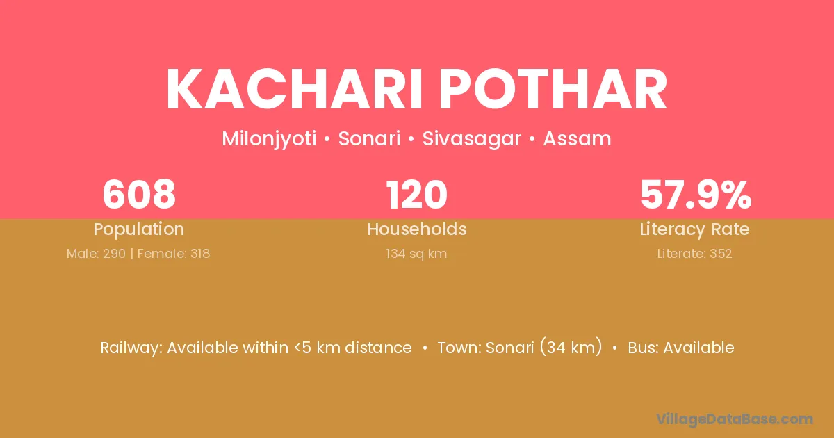 Kachari Pothar village has a total population of 608 people, of which 290 are males and 318 are females.