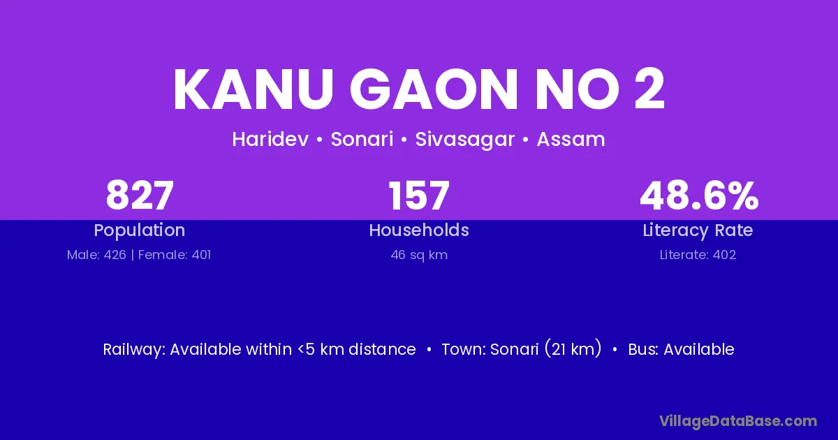 Kanu Gaon No 2 village has a total population of 827 people, of which 426 are males and 401 are females.