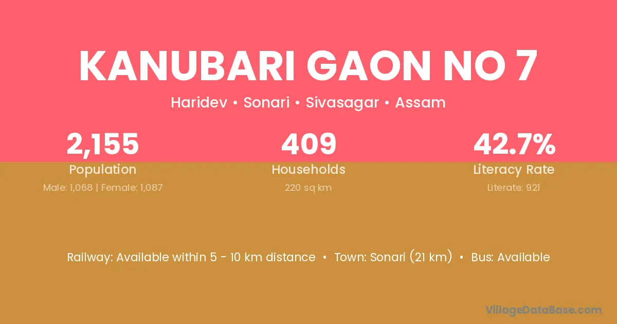 Sonari (21 km) is the nearest town to Kanubari Gaon No 7 village for major economic activities and is located approximately 21 km away.