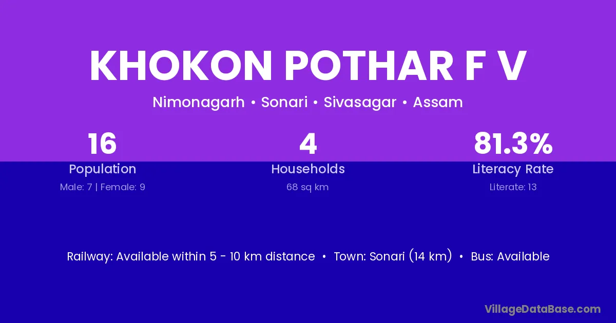 Sonari (14 km) is the nearest town to Khokon Pothar F V village for major economic activities and is located approximately 14 km away.