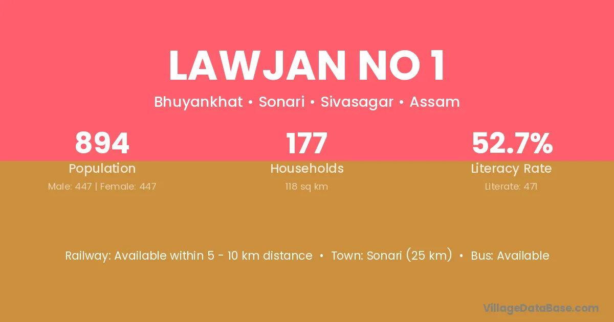 Sonari (25 km) is the nearest town to Lawjan No 1 village for major economic activities and is located approximately 25 km away.