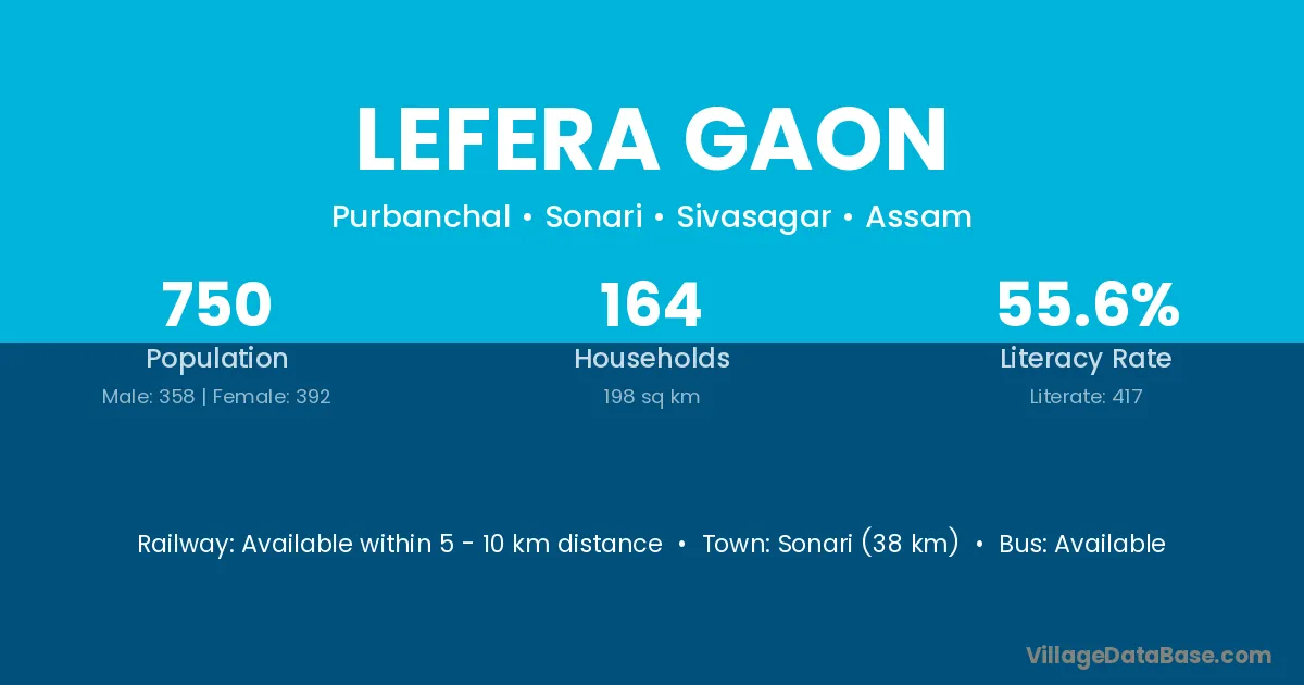 Sonari (38 km) is the nearest town to Lefera Gaon village for major economic activities and is located approximately 38 km away.